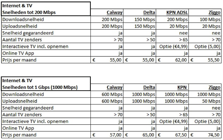 Stap je over op glasvezel? Voor de kosten hoef je het zéker niet te laten. Kijk bijvoorbeeld in onderstaande tabel de reguliere tarieven van de providers (exclusief tijdelijke actiekortingen):